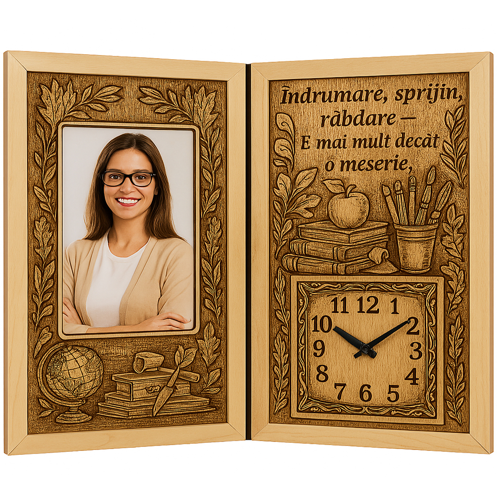 Un cadou simbolic și emoționant, creat cu grijă pentru cei care modelează caractere, inspiră generații și oferă nu doar cunoștințe, ci și încredere, valori și iubire pentru învățare. Acest tablou personalizat carte din lemn cu ceas este un produs unic pe piață, realizat manual și gândit special pentru a onora munca și devotamentul cadrelor didactice.