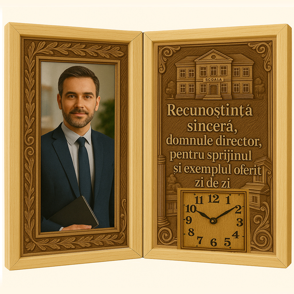 Un cadou special, dedicat unui director care a condus cu viziune, echilibru și responsabilitate. Acest tablou personalizat, în formă de carte din lemn cu ceas funcțional integrat, este mai mult decât un obiect decorativ – este un simbol al recunoștinței și respectului față de un om care a influențat pozitiv întreaga comunitate școlară.