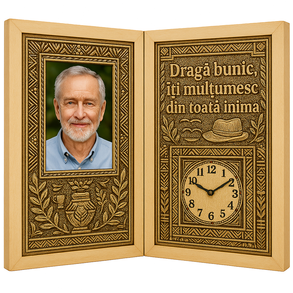 Un cadou cu suflet, creat pentru omul care ți-a fost sprijin, erou și povestitor de neuitat. Acest tablou personalizat carte din lemn cu ceas este un produs unic pe piață, realizat manual, special pentru a onora bunicul care ți-a fost mereu aproape cu blândețe, curaj și sfaturi înțelepte.