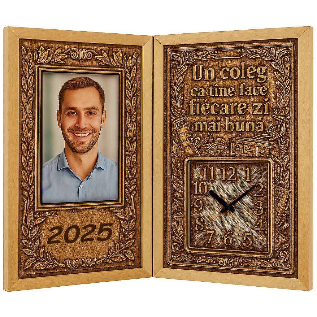 Un cadou simbolic și elegant, creat pentru acel coleg care a fost mereu alături: cu un sfat bun, cu un zâmbet la momentul potrivit sau pur și simplu cu o atitudine pozitivă care face diferența. Acest tablou personalizat carte din lemn cu ceas este un produs unic pe piață, realizat manual, perfect pentru a marca o colaborare frumoasă și a arăta recunoștință sinceră.