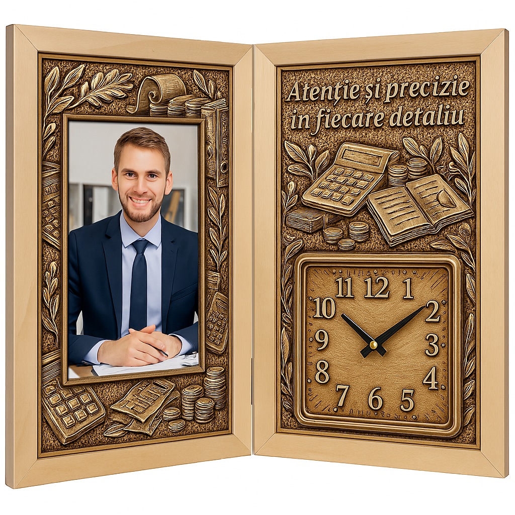 Un cadou rafinat și original pentru cei care dau sens cifrelor și echilibrului financiar. Această carte din lemn personalizată, cu ceas funcțional integrat, este un produs unic pe piață, conceput special pentru a celebra profesionalismul și dedicația unui contabil.