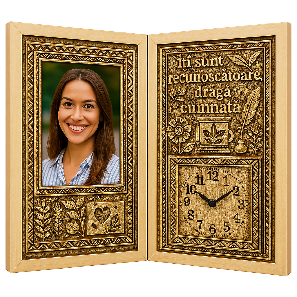 Un cadou cu suflet, creat pentru o femeie care a devenit mai mult decât familie – o prietenă de încredere, un sprijin și o prezență caldă în viața ta. Acest tablou personalizat carte din lemn cu ceas este un produs unic pe piață, realizat manual, ideal pentru a-ți exprima admirația și recunoștința față de o cumnată deosebită.