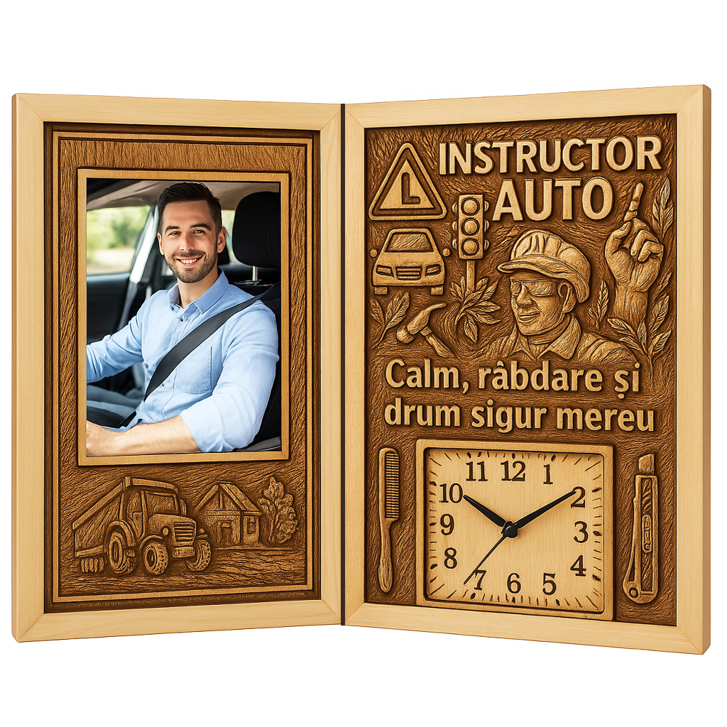 Un cadou simbolic și cu adevărat special, dedicat celui care are răbdarea să formeze șoferi, încrederea de a-i ghida și calmul de a învăța cu zâmbetul pe buze. Acest tablou personalizat carte din lemn cu ceas este un produs unic pe piață, realizat manual, creat special pentru a arăta respectul și aprecierea față de un instructor auto devotat.