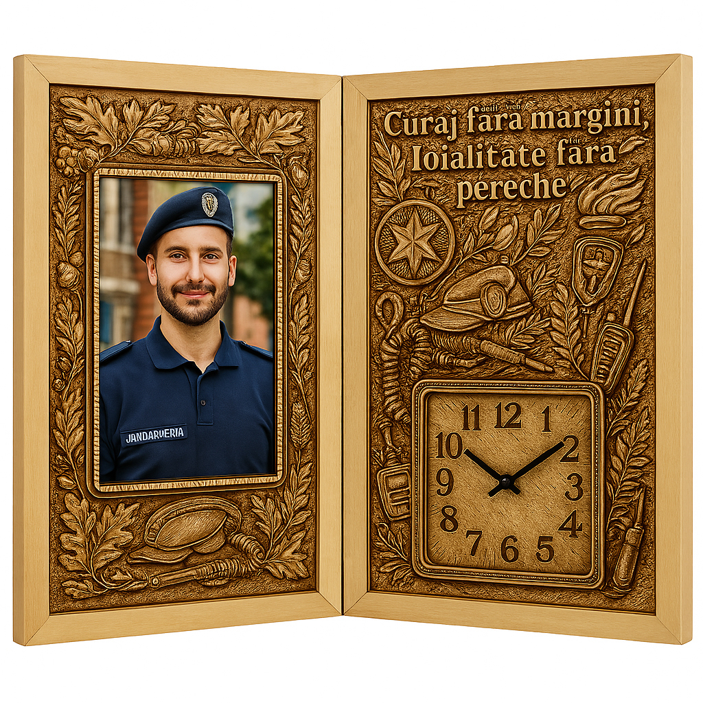 Un cadou de înaltă ținută, creat pentru cei care apără legea, ordinea și siguranța cetățenilor cu onoare, disciplină și loialitate. Acest tablou personalizat carte din lemn cu ceas este un produs unic pe piață, realizat manual și dedicat jandarmilor care își fac meseria cu demnitate și curaj.