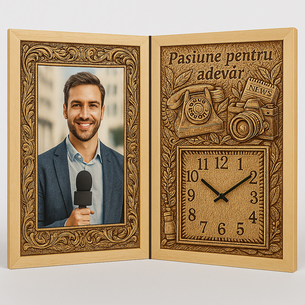 Un cadou cu profunzime, rafinament și semnificație – creat special pentru cel care caută adevărul, pune întrebările potrivite și dă voce realității. Acest tablou personalizat carte din lemn cu ceas este un produs unic pe piață, realizat manual, dedicat jurnaliștilor care își transformă pasiunea pentru cuvinte într-o misiune de viață.