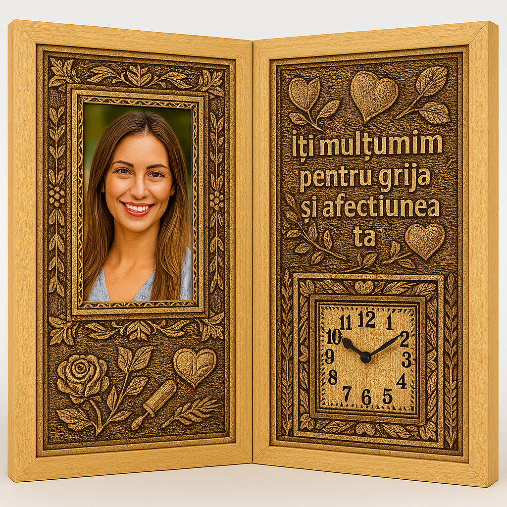 Un cadou special, creat pentru femeia care nu doar că a devenit parte din familie, dar a adus cu ea lumină, echilibru și căldură sufletească. Acest tablou personalizat carte din lemn cu ceas este un produs unic pe piață, realizat manual, gândit să exprime recunoștință, respect și dragoste pentru o noră deosebită.