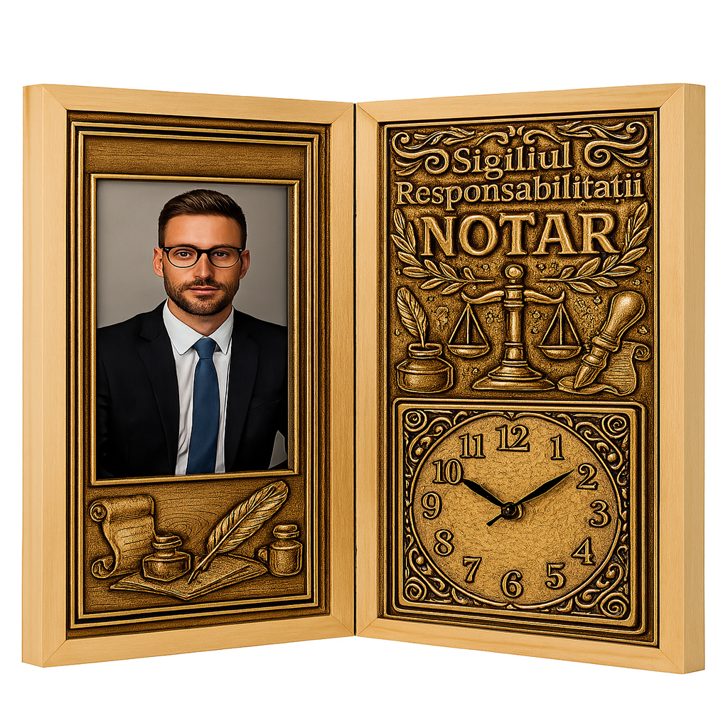 Un cadou cu rafinament și profunzime, creat pentru cei care veghează asupra legalității, înțelegerii și echilibrului în relațiile dintre oameni. Acest tablou personalizat carte din lemn cu ceas este un produs unic pe piață, realizat manual, cu un design care îmbină autoritatea profesională cu eleganța detaliului, fiind ideal pentru a onora activitatea unui notar dedicat.
