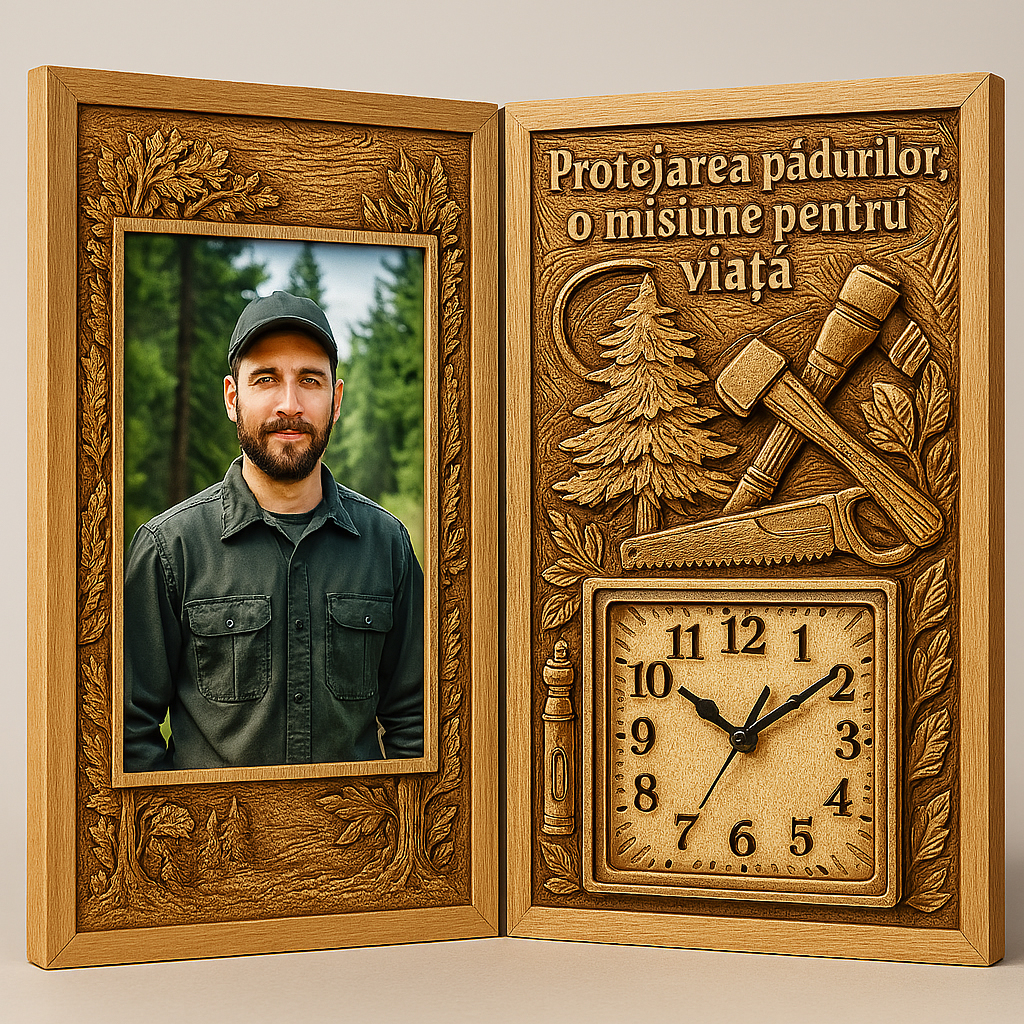 Un cadou de suflet pentru cei care veghează asupra pădurilor cu loialitate, respect și devotament. Acest tablou personalizat carte din lemn cu ceas este un produs unic pe piață, realizat manual, cu o simbolistică profundă dedicată celor care trăiesc în armonie cu natura și îi protejează echilibrul.