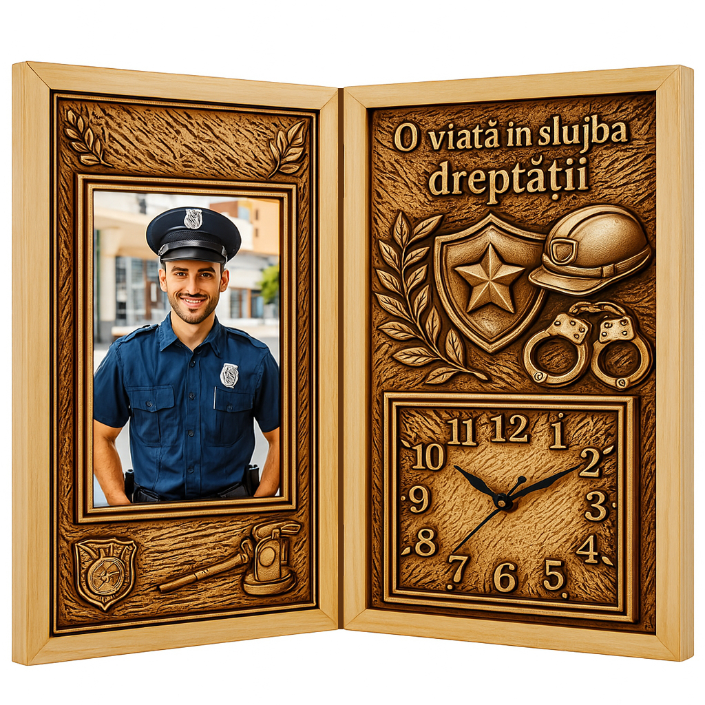Un cadou simbolic, elegant și profund, dedicat celor care își dedică viața siguranței, ordinii și binelui public. Acest tablou personalizat carte din lemn cu ceas este un produs unic pe piață, realizat manual și conceput pentru a onora cu respect și admirație activitatea unui polițist devotat.