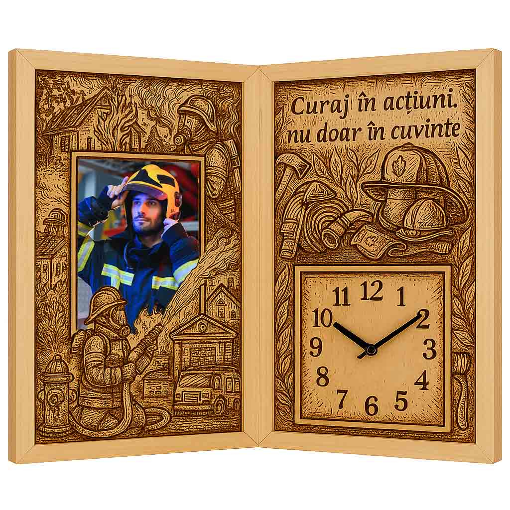 Carte din Lemn Personalizată cu Ceas – Cadou Unic pentru Pompier