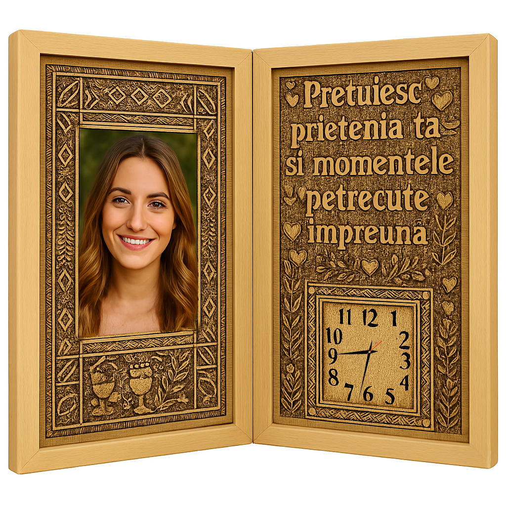Un cadou cu suflet, creat pentru acea prietenă specială care ți-a fost alături la bine și la greu, care te-a făcut să râzi când aveai nevoie cel mai mult și care a transformat momentele obișnuite în amintiri de neuitat. Acest tablou personalizat carte din lemn cu ceas este un produs unic pe piață, realizat manual, gândit pentru a spune „Îți mulțumesc că exiști” într-un mod elegant și sincer.