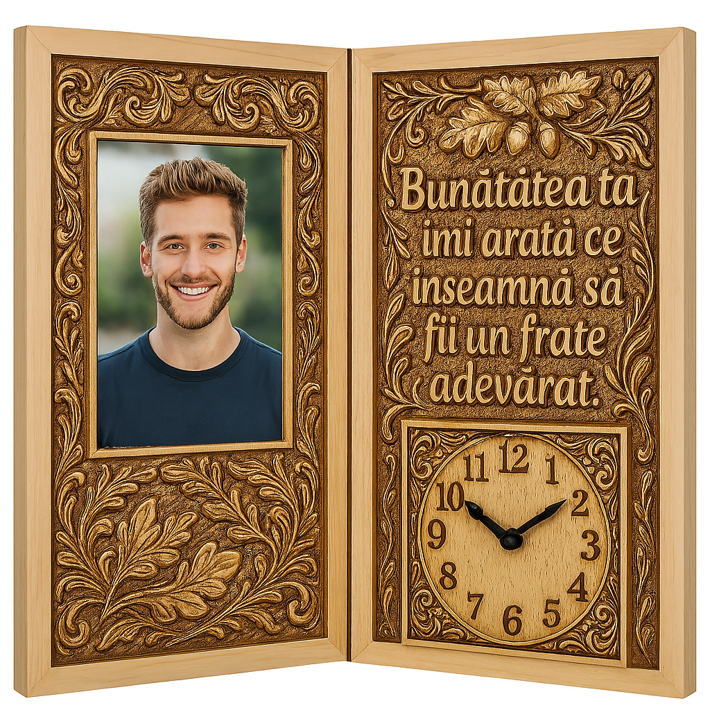 Un cadou cu greutate emoțională, creat pentru cel care ți-a fost partener de joacă, confident și sprijin în orice moment. Acest tablou personalizat carte din lemn cu ceas este un produs unic pe piață, realizat manual, gândit pentru a-i arăta fratelui tău cât de mult înseamnă pentru tine, printr-un gest sincer și memorabil.