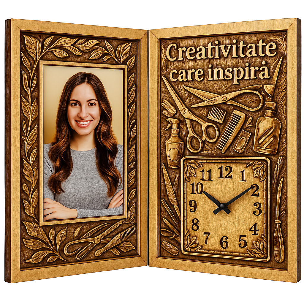 Un cadou care îmbină eleganța cu personalitatea – perfect pentru cel sau cea care transformă frumusețea în artă și stilul într-o formă de expresie. Acest tablou personalizat carte din lemn cu ceas este un produs unic pe piață, realizat manual și conceput special pentru a onora pasiunea, creativitatea și dedicarea unui stylist.