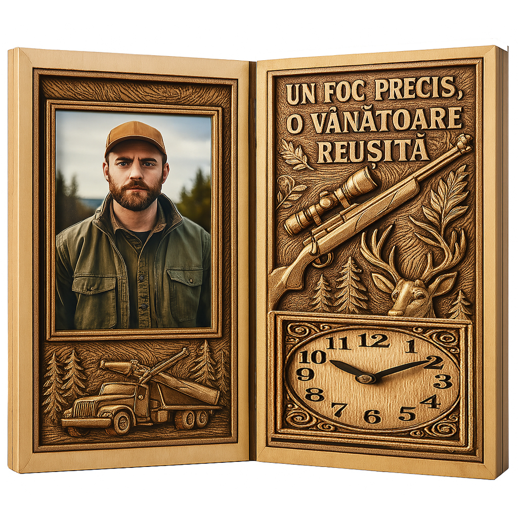 Un cadou cu adevărat special pentru cei care respectă natura, vânează cu pasiune și înțeleg tăcerea pădurii. Acest tablou personalizat carte din lemn cu ceas este un produs unic pe piață, realizat manual și conceput pentru a reflecta personalitatea unui vânător autentic.