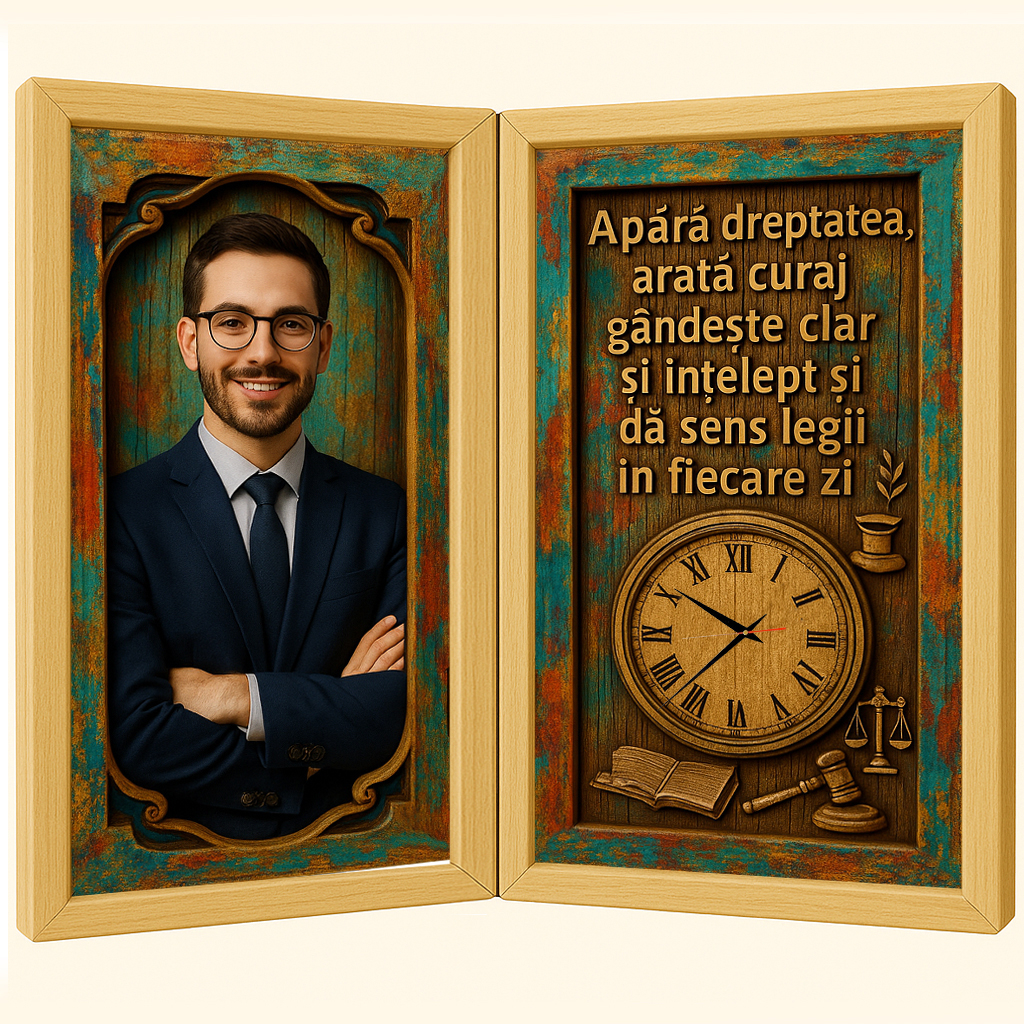 Creat cu rafinament și atenție la detalii, acest tablou din lemn sub formă de carte este un omagiu pentru un avocat care apără dreptatea cu demnitate, echilibru și profesionalism. Realizat manual și personalizat cu mesaj și fotografie, este un cadou memorabil ce reflectă respectul față de o carieră construită pe etică, logică și devotament.