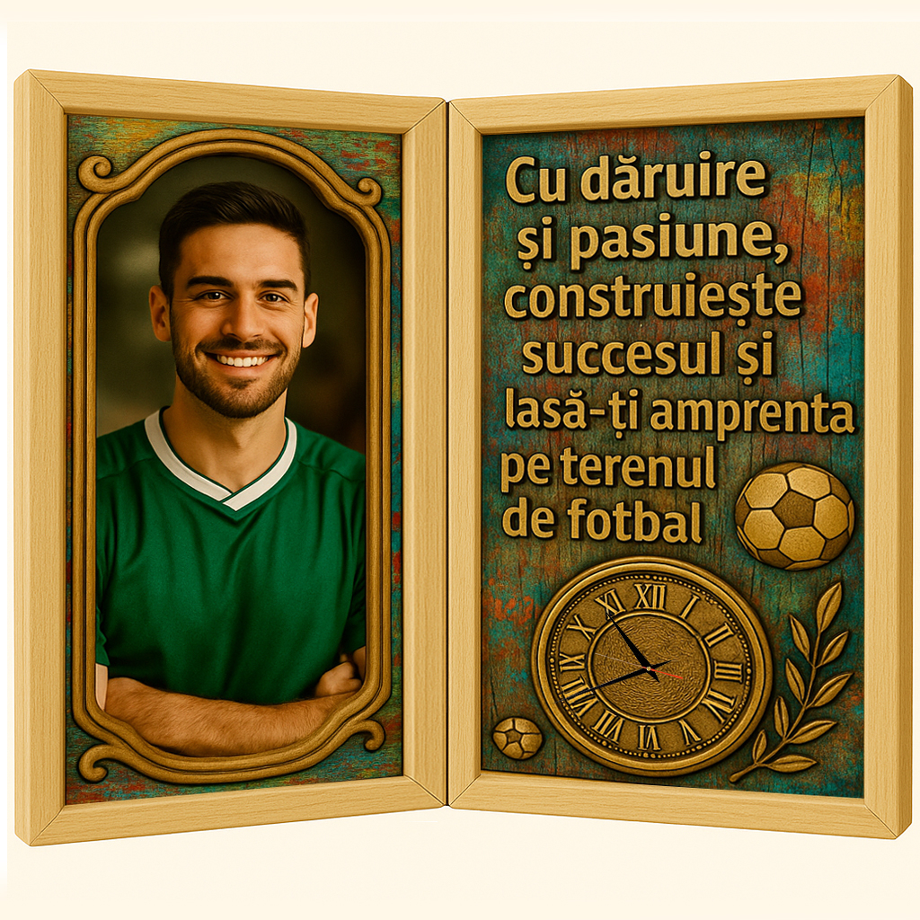 Tabloul tip carte cu ceas funcțional nu este doar decorativ – este o amintire puternică și personală pentru un fotbalist care a demonstrat ce înseamnă să lupți cu pasiune, să crezi și să inspiri.