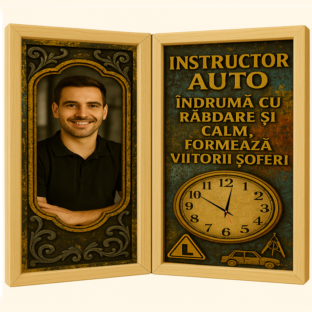 Acest tablou din lemn, realizat manual sub forma unei cărți , este o expresie de apreciere pentru un instructor auto care a format cu răbdare, a ghidat cu calm și a pregătit generații întregi pentru drumurile vieții. Un cadou simbolic, elegant și profund, pentru omul care a oferit mai mult decât lecții – a oferit încredere.