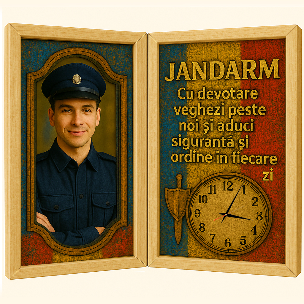 Tabloul tip carte cu ceas funcțional este o amintire profundă și elegantă, dedicată unui jandarm care a fost și va rămâne un simbol al protecției, curajului și echilibrului.