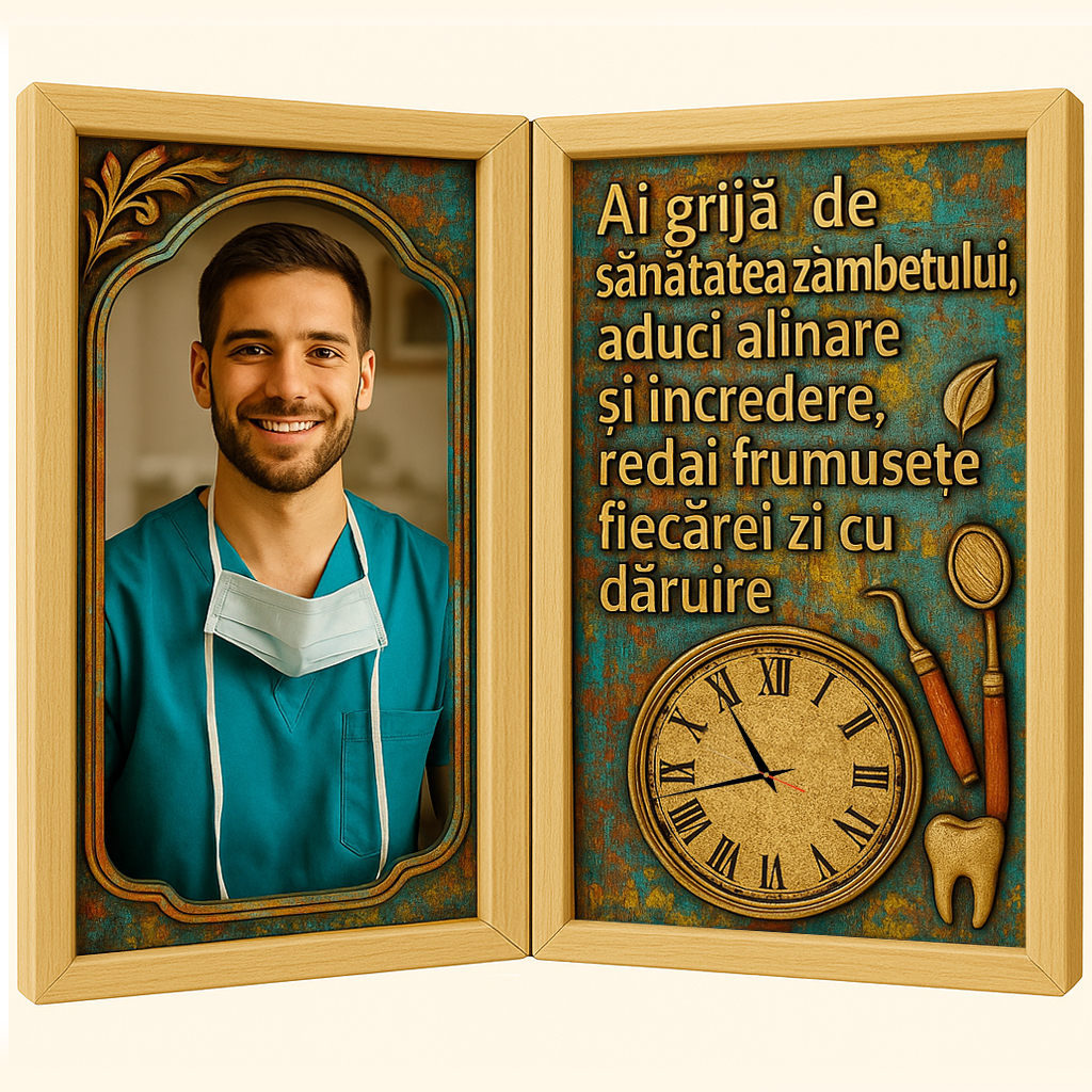 Tabloul tip carte cu ceas este o piesă decorativă cu semnificație profundă – o expresie de apreciere față de un stomatolog care a transformat fiecare intervenție într-un act de încredere și respect.
