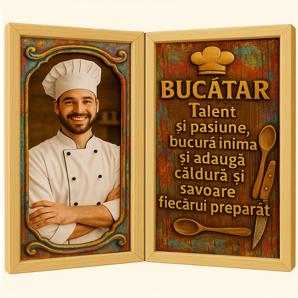Tablou personalizat din lemn, realizat sub forma unei cărți – un cadou cu savoare și respect pentru un bucătar care transformă ingrediente în artă, rețetele în emoții și mesele în amintiri. Lucrat manual din lemn natural, acest obiect nu este doar decorativ, ci o recunoaștere sinceră pentru măiestria, pasiunea și dăruirea cu care se creează fiecare farfurie.