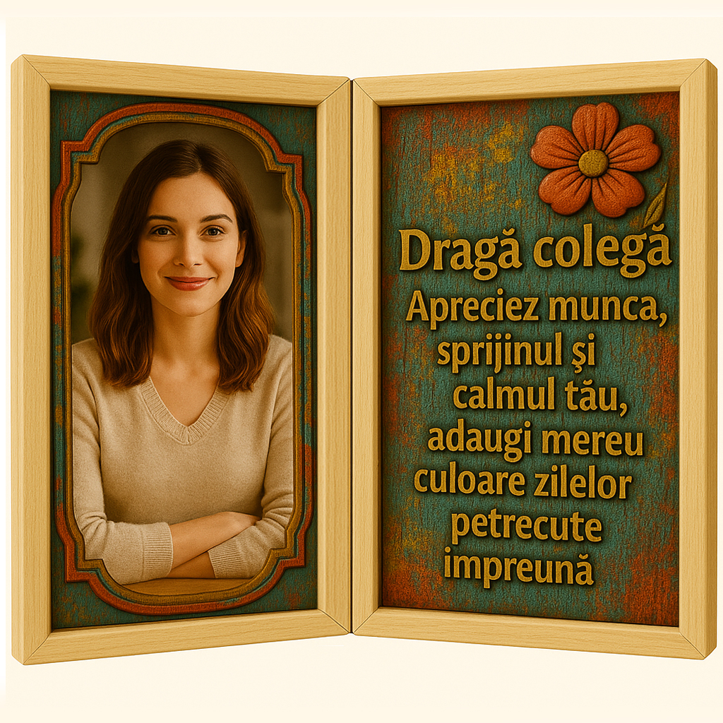 Tablou personalizat din lemn, realizat sub forma unei cărți – un cadou elegant și plin de semnificație pentru o colegă care a adus energie bună, profesionalism și sprijin autentic în fiecare zi de lucru. Lucrat manual din lemn natural, acest obiect cu valoare emoțională este o formă sinceră de apreciere pentru tot ce a însemnat prezența ei într-o echipă, într-un proiect sau într-o etapă comună.