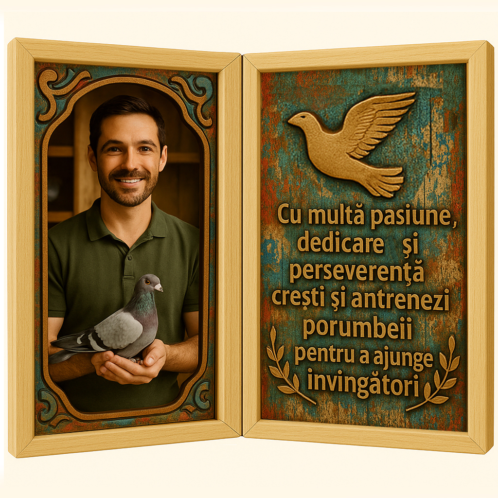 Tablou personalizat din lemn, realizat în stil carte – un cadou cu suflet pentru un columbofil pasionat, care a trăit cu inima alături de zborul porumbeilor și frumusețea libertății. Creat manual din lemn natural, acest obiect este mai mult decât decor – este o amintire vie, cu valoare emoțională, ce exprimă admirația pentru răbdarea, dăruirea și eleganța unei pasiuni aparte.