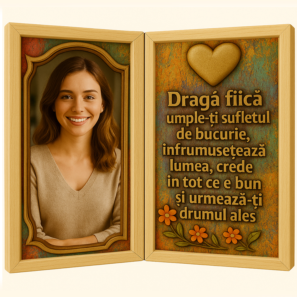 Tablou personalizat din lemn, realizat sub forma unei cărți – un cadou cu suflet pentru o fiică iubită, care aduce lumină, mândrie și sens în viața părinților săi. Lucrat manual din lemn natural, acest obiect este mai mult decât o piesă decorativă – este o amintire încărcată de dragoste, emoție și recunoștință pentru tot ceea ce este și înseamnă ea.
