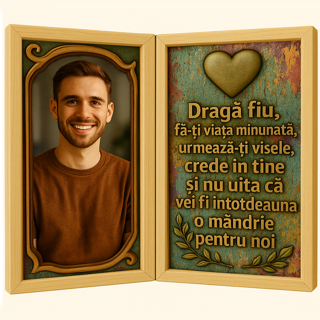 Tablou personalizat din lemn, realizat sub forma unei cărți – un cadou emoționant pentru un fiu iubit, care a adus bucurie, sens și mândrie în inima părinților. Lucrat manual din lemn natural, acest obiect simbolic este mai mult decât o piesă decorativă – este o dovadă sinceră de dragoste, sprijin și recunoștință pentru omul în care s-a pus toată încrederea și speranța.
