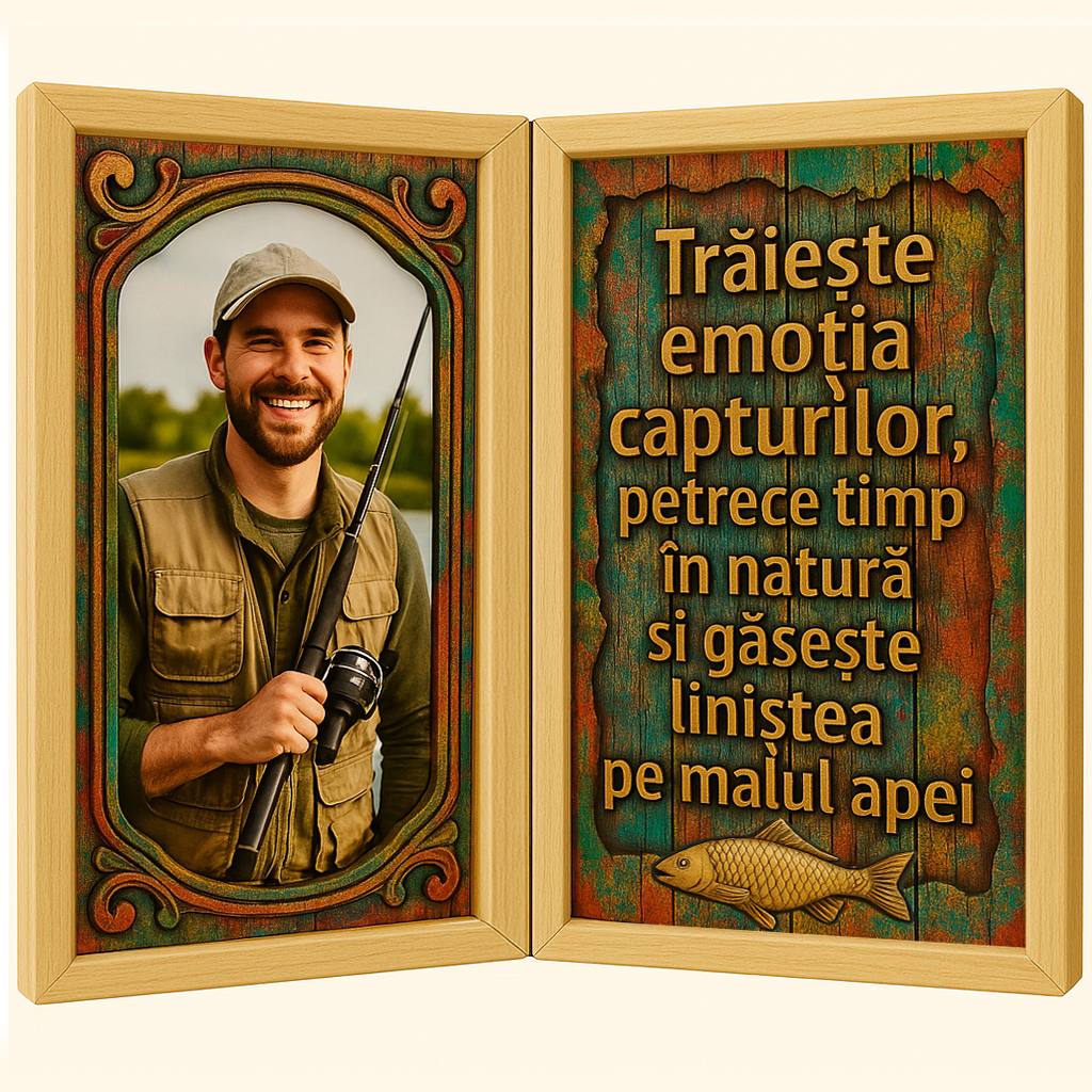 Tablou personalizat din lemn, realizat sub forma unei cărți – un cadou memorabil pentru un pescar pasionat, care și-a petrecut orele în liniștea apelor, în așteptarea momentelor perfecte. Creat manual din lemn natural, acest obiect este mai mult decât decor – este o expresie sinceră de apreciere pentru răbdarea, pasiunea și bucuria simplă a legăturii cu natura.
