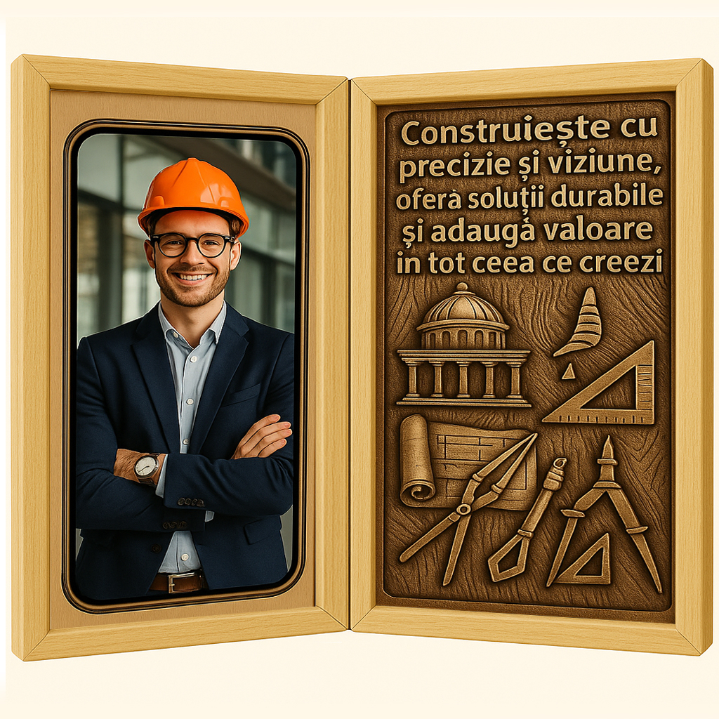 Tablou personalizat din lemn tip carte – cadou inedit pentru un arhitect care dă formă ideilor și transformă schițele în spații pline de viață. Realizat manual, cu atenție la detalii și personalizare completă, acest cadou este o expresie elegantă de recunoaștere pentru creativitate, rigoare și pasiunea pentru estetic și funcțional. O alegere simbolică pentru o carieră în care fiecare linie contează.