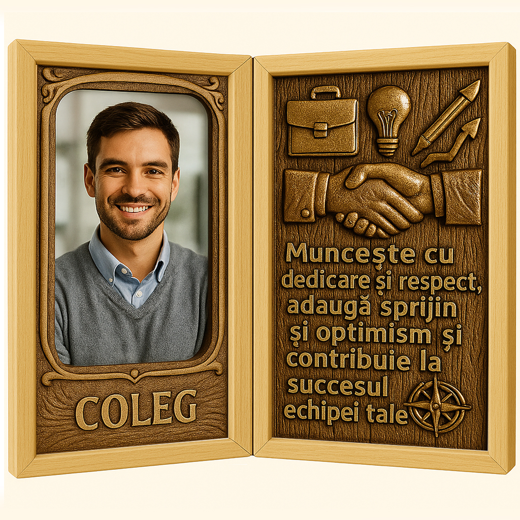 Tablou personalizat din lemn tip carte – cadou inedit pentru colegul care aduce echilibru, profesionalism și bună dispoziție în fiecare zi de lucru. Creat manual, cu atenție la detalii și personalizare completă, acest cadou este o modalitate elegantă de a spune mulțumesc pentru colaborare, sprijin sau pur și simplu pentru o prietenie frumoasă formată la birou.