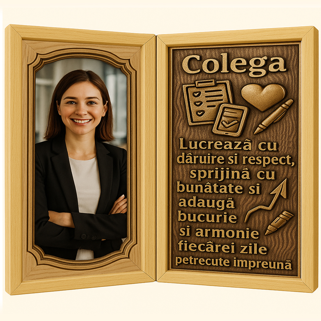 Tablou personalizat din lemn tip carte – cadou inedit pentru colega care aduce zâmbete la birou, idei în echipă și energie pozitivă în fiecare zi. Lucrat manual, cu detalii elegante și posibilitate de personalizare completă, acest cadou este un mod original și emoționant de a-i arăta că prezența ei contează. Un gest frumos, ce transformă relația profesională într-o amintire de durată.