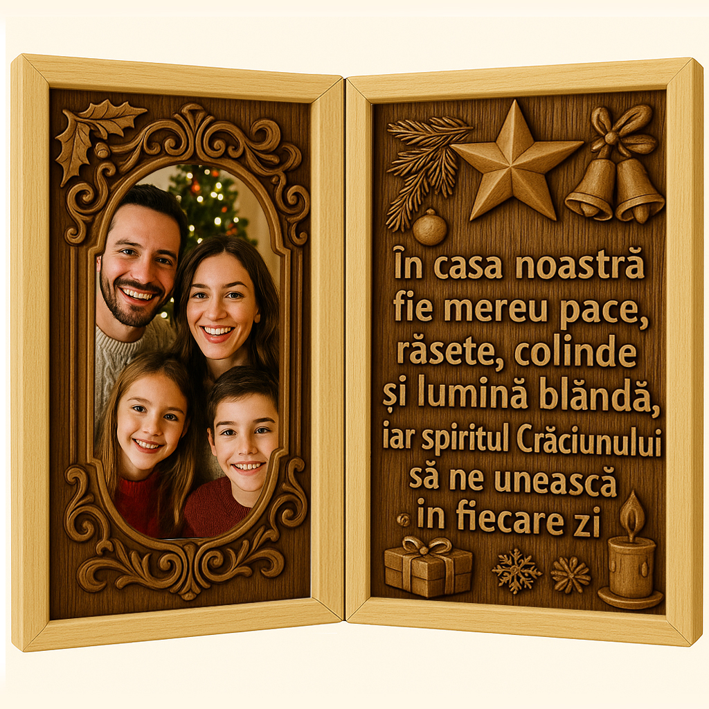 Acest tablou din lemn tip carte nu este doar un obiect decorativ – este un mesaj de iubire, pace și recunoștință, într-o formă care va rămâne vie an de an, alături de cele mai frumoase amintiri de sărbătoare.