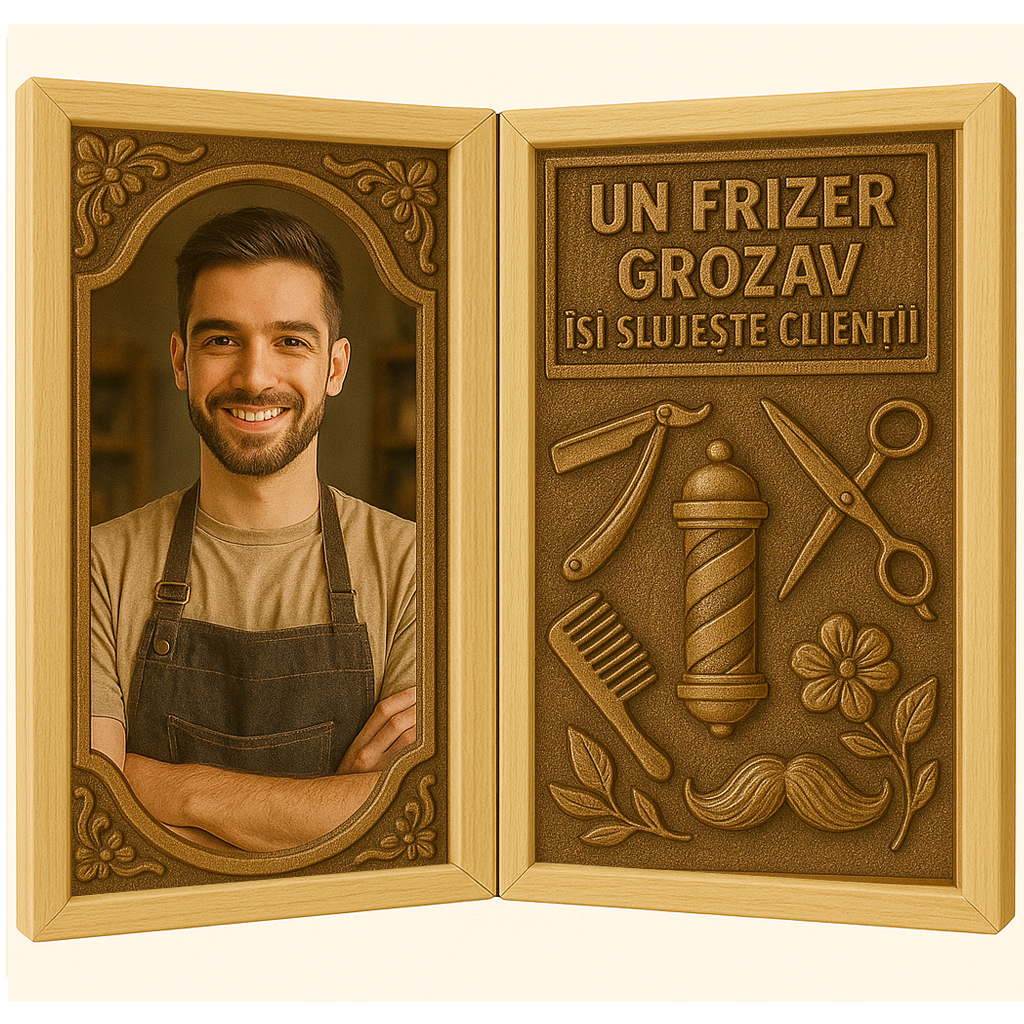 Un cadou care spune "respect pentru pasiune și talent". Această carte din lemn, lucrată manual și complet personalizabilă, este un omagiu adus artei frizeriei și dedicării în meserie. Cu un design elegant și detalii fine, reprezintă o alegere inspirată pentru a-i arăta frizerului tău cât de mult apreciezi profesionalismul și contribuția sa la imaginea ta.