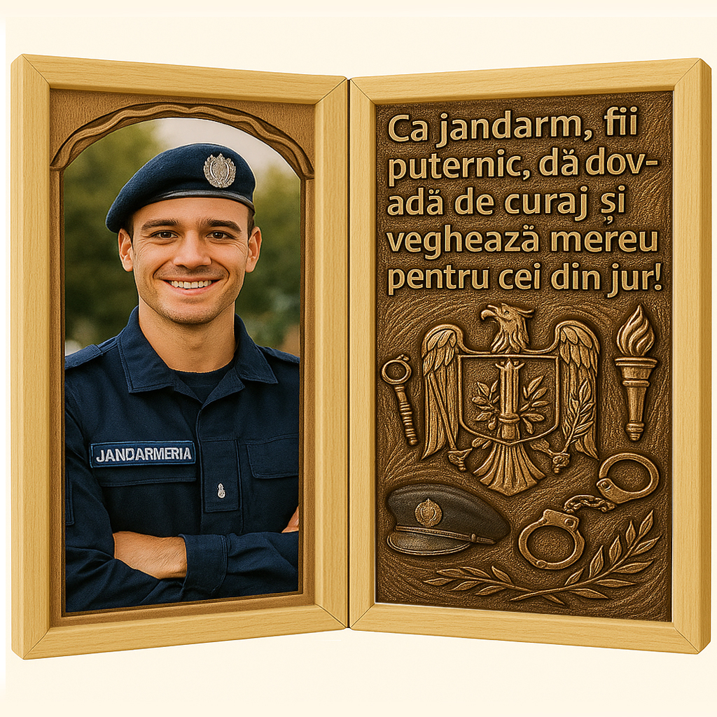 Tablou personalizat din lemn tip carte – cadou inedit pentru un jandarm care servește cu devotament, curaj și onoare. Realizat manual, cu detalii fine și eleganță aparte, acest cadou este o formă vizuală de recunoștință pentru cei care protejează și inspiră. Personalizarea completă îl transformă într-un simbol memorabil al datoriei îndeplinite cu mândrie.