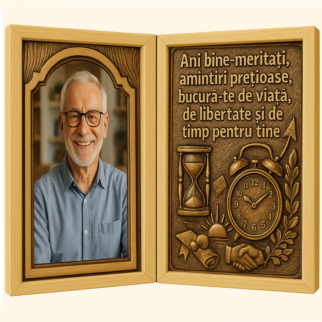 Acest tablou personalizat în formă de carte din lemn nu este doar un cadou – este un omagiu vizual adus unei vieți profesionale încheiate cu demnitate, o amintire de suflet care va rămâne în inimă și în decorul casei pentru totdeauna.