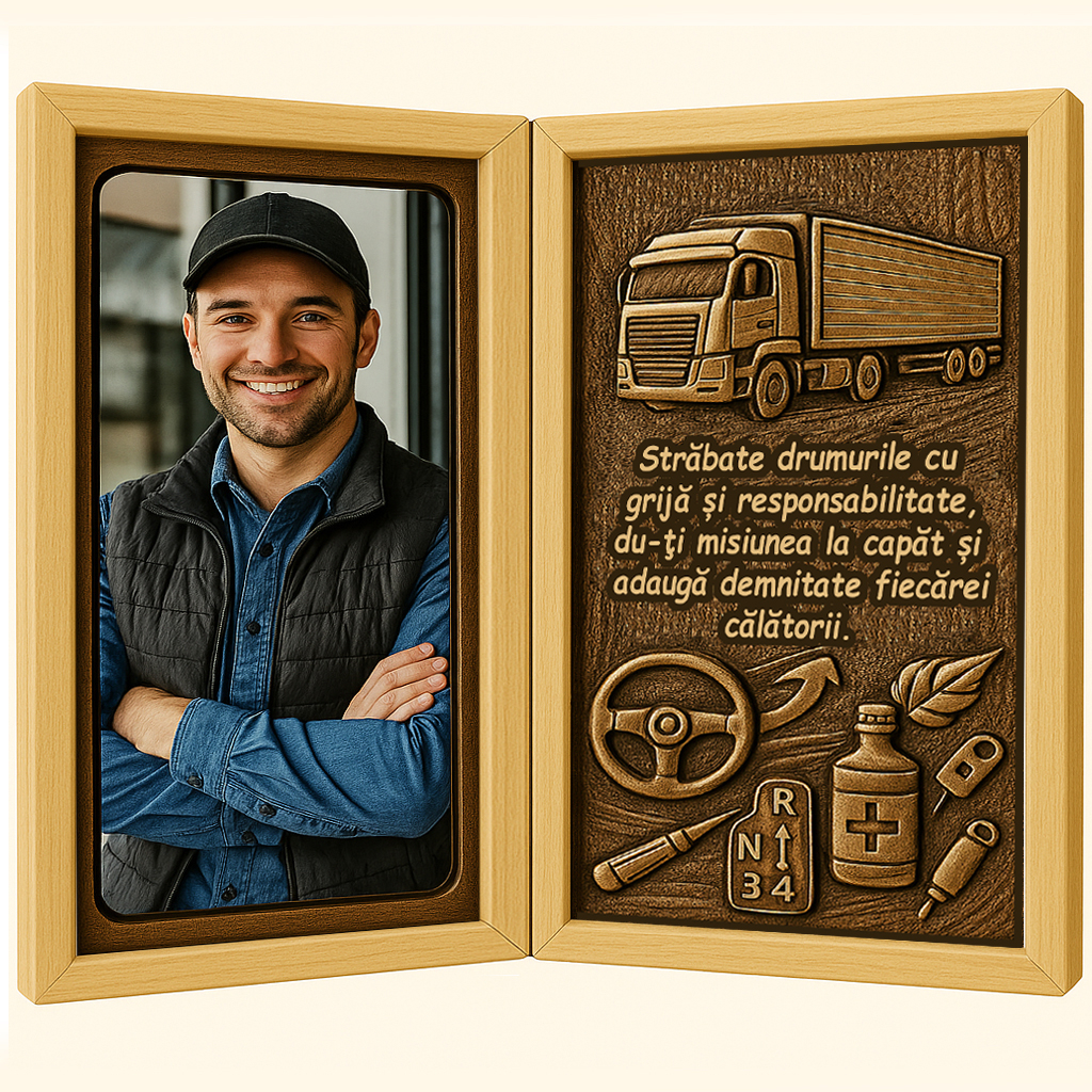 Acest tablou din lemn tip carte nu este doar un obiect decorativ – este o dovadă de recunoștință pentru omul care, deși este mereu pe drum, rămâne mereu aproape prin ceea ce face. Un cadou cu suflet, pe măsura unui adevărat profesionist al volanului.