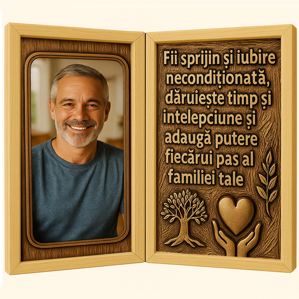 Tablou personalizat din lemn tip carte – cadou inedit pentru tatăl care a fost mereu acolo: sprijin, exemplu, ghid și prieten. Realizat manual din lemn natural și personalizabil integral, acest cadou este o formă sinceră de a spune mulțumesc, tată, într-un mod unic, care se păstrează o viață întreagă. Un simbol al recunoștinței și al iubirii față de cel care a clădit cu răbdare temelia familiei.