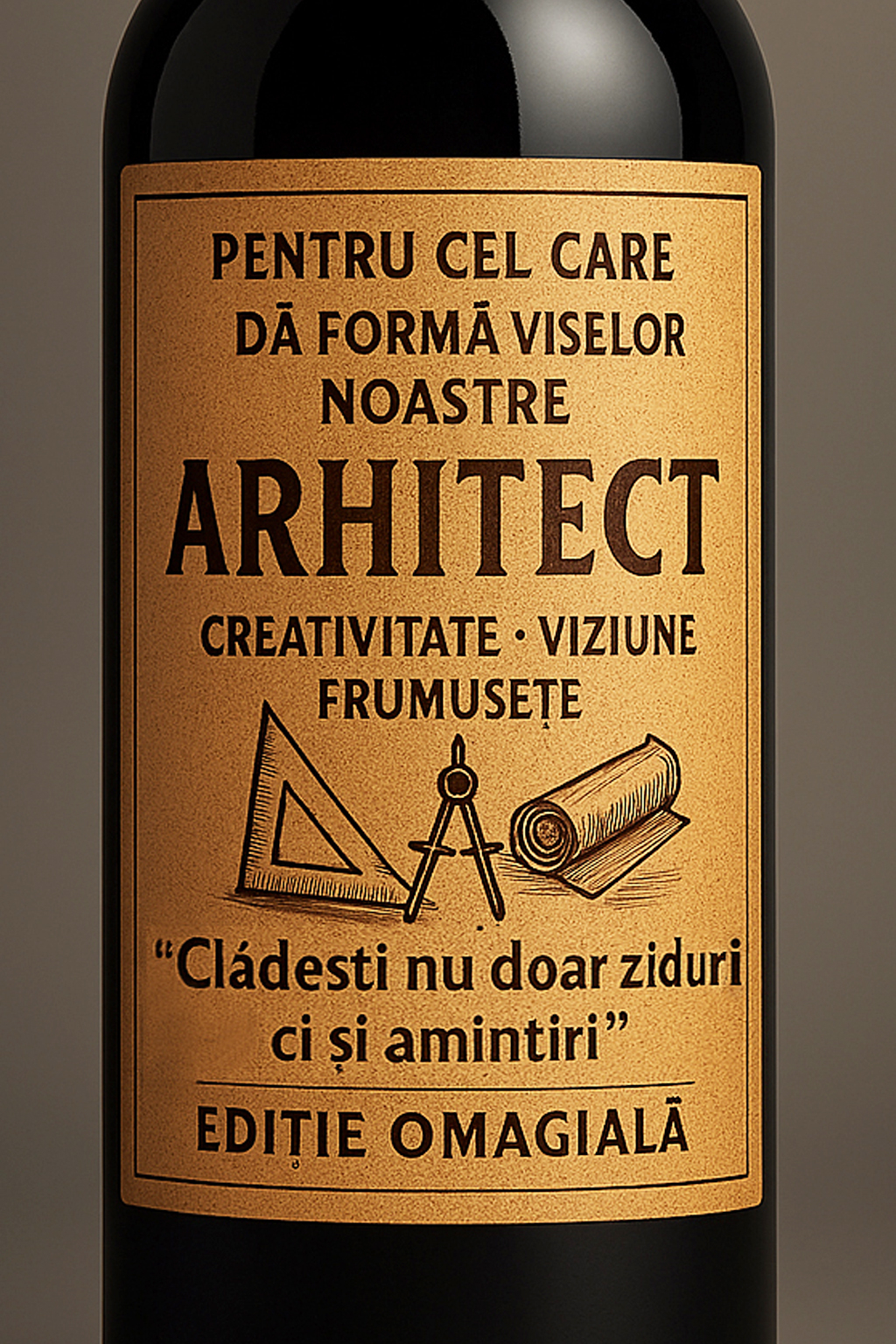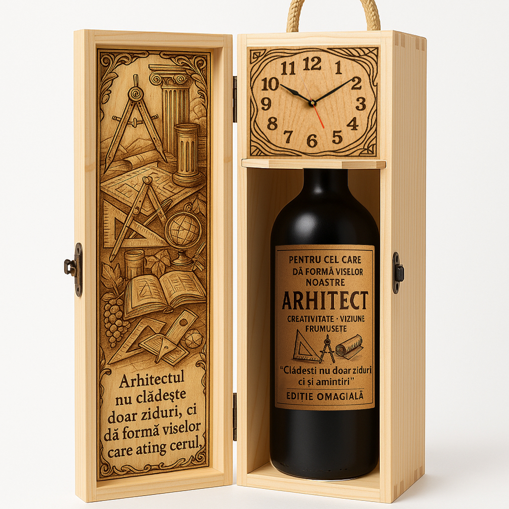 Interiorul, conceput cu precizie, include un ceas funcțional, simbol al măsurii perfecte și al timpului dedicat creației. Setul conține o sticlă de vin roșu de 750 ml, cu etichetă personalizată, iar textele din interior pot fi adaptate pentru un mesaj elegant de apreciere și respect față de talentul și munca depusă.
