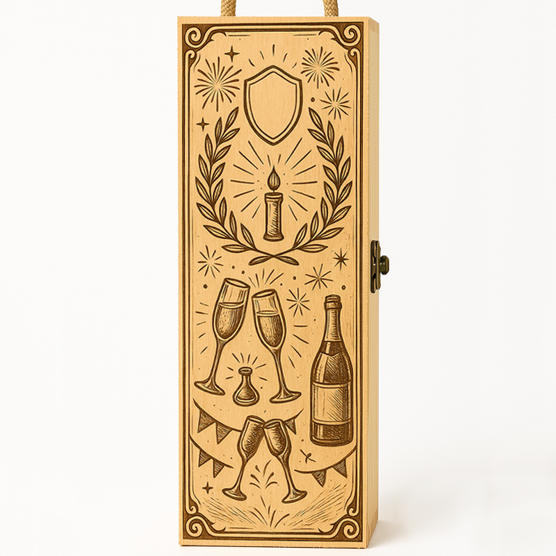 Un cadou elegant, perfect pentru a sărbători o zi de naștere sau o aniversare importantă. Cutia din lemn de pin, prevăzută cu mâner din sfoară și închidere metalică, impresionează prin aspectul natural și rafinat – o alegere de lux pentru o persoană specială, care merită un gest pe măsura momentului.