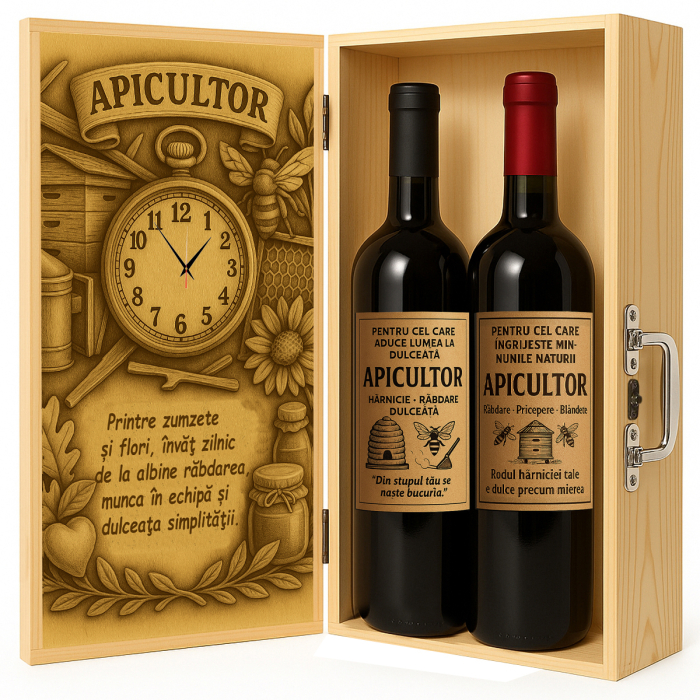 Interiorul, realizat cu rafinament, include un ceas funcțional, simbol al timpului dedicat stupinei și al armoniei dintre om și natură. Setul conține două sticle de vin a 750 ml, fiecare cu etichetă personalizată, iar textele din interior pot fi adaptate pentru a transmite un mesaj de apreciere, recunoștință sau felicitare.