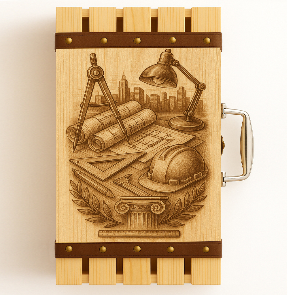 Un cadou inspirat, dedicat unei profesii care îmbină precizia cu arta. Această cutie din lemn de pin tip cufăr, cu inserții din piele și închidere metalică, reprezintă o alegere rafinată pentru un cadou de lux potrivit unui arhitect.