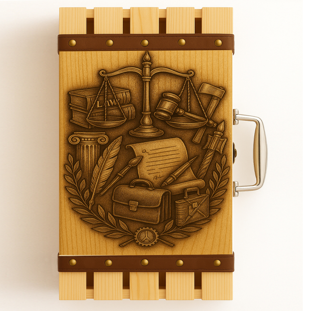 Un cadou rafinat, potrivit pentru un avocat care apreciază eleganța, ordinea și prestigiul. Cutia din lemn de pin tip cufăr, cu inserții din piele și închidere metalică, se remarcă prin echilibru vizual și o prezentare de lux, care inspiră încredere și bun gust. Este alegerea ideală pentru un profesionist care îmbină rigoarea cu finețea în tot ceea ce face.
