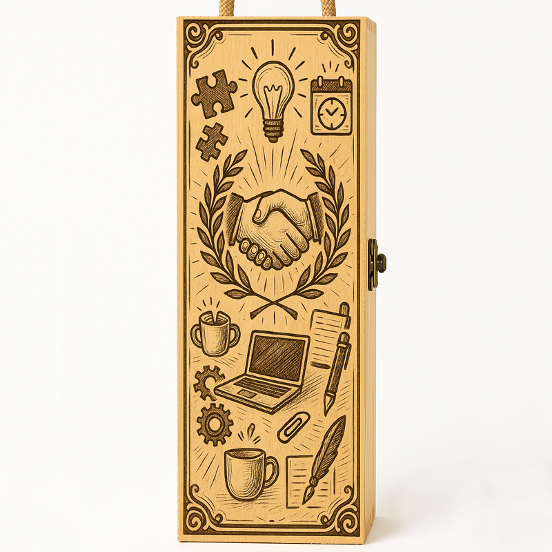 Un cadou elegant, care exprimă respectul, aprecierea și spiritul de echipă. Cutia din lemn de pin, prevăzută cu mâner din sfoară și închidere metalică, impresionează prin designul sobru și rafinat – o alegere de lux, potrivită pentru un coleg care se remarcă prin profesionalism, bun gust și dedicare.