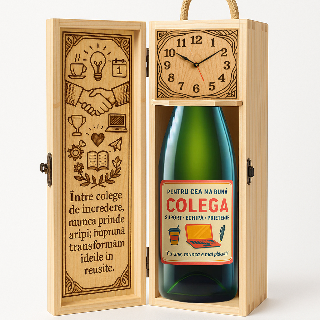Interiorul este conceput cu grijă pentru detalii și include un ceas funcțional, simbol al timpului prețios petrecut împreună și al echilibrului în viața profesională și personală. În interior se află o sticlă de șampanie de 750 ml, cu etichetă personalizată, unde pot fi adăugate mesaje de mulțumire, urări sau dedicații speciale, transformând darul într-o amintire unică.