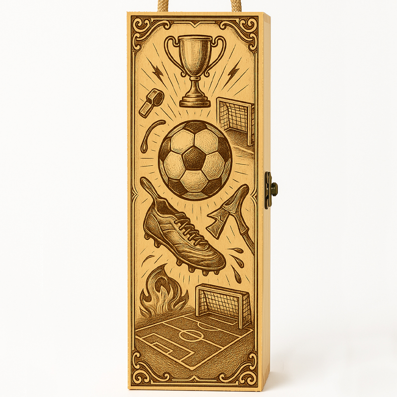 Un cadou elegant, care exprimă aprecierea pentru talent, ambiție și spiritul competitiv al unui adevărat fotbalist. Cutia din lemn de pin, prevăzută cu mâner din sfoară și închidere metalică, impresionează prin designul sobru și rafinat – o prezentare de lux, potrivită pentru un sportiv care joacă cu pasiune și dedicare.
