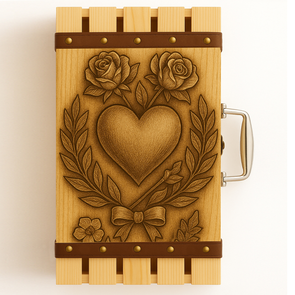 Un cadou plin de eleganță și semnificație, potrivit pentru cea mai importantă persoană din viața ta. Cutia din lemn de pin tip cufăr, cu inserții din piele și închidere metalică, impresionează prin rafinament, atenție la detalii și o prezentare de lux, care transmite iubire și recunoștință.
