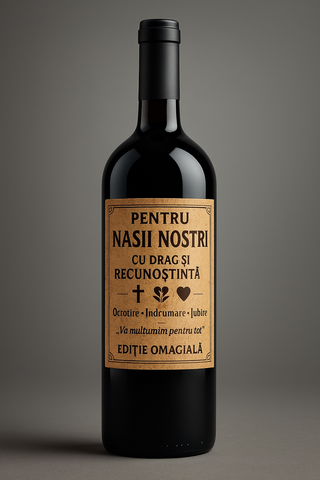 Setul conține două sticle de vin a 750 ml, fiecare cu etichetă personalizată, iar textele din interior pot fi adaptate pentru a reda un mesaj de mulțumire și admirație față de nași.