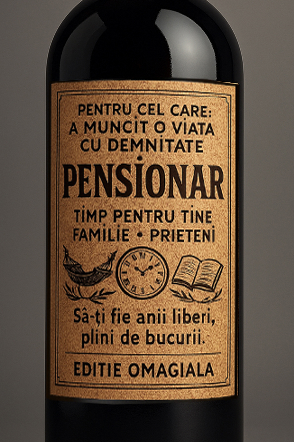 Interiorul, conceput cu atenție la detalii, include un ceas funcțional, simbol al timpului care, de acum, aparține celui ce a muncit cu demnitate. În interior se află o sticlă de vin roșu de 750 ml, cu etichetă personalizată, iar textele pot fi adaptate pentru a reda un mesaj de apreciere și urări de viață liniștită.