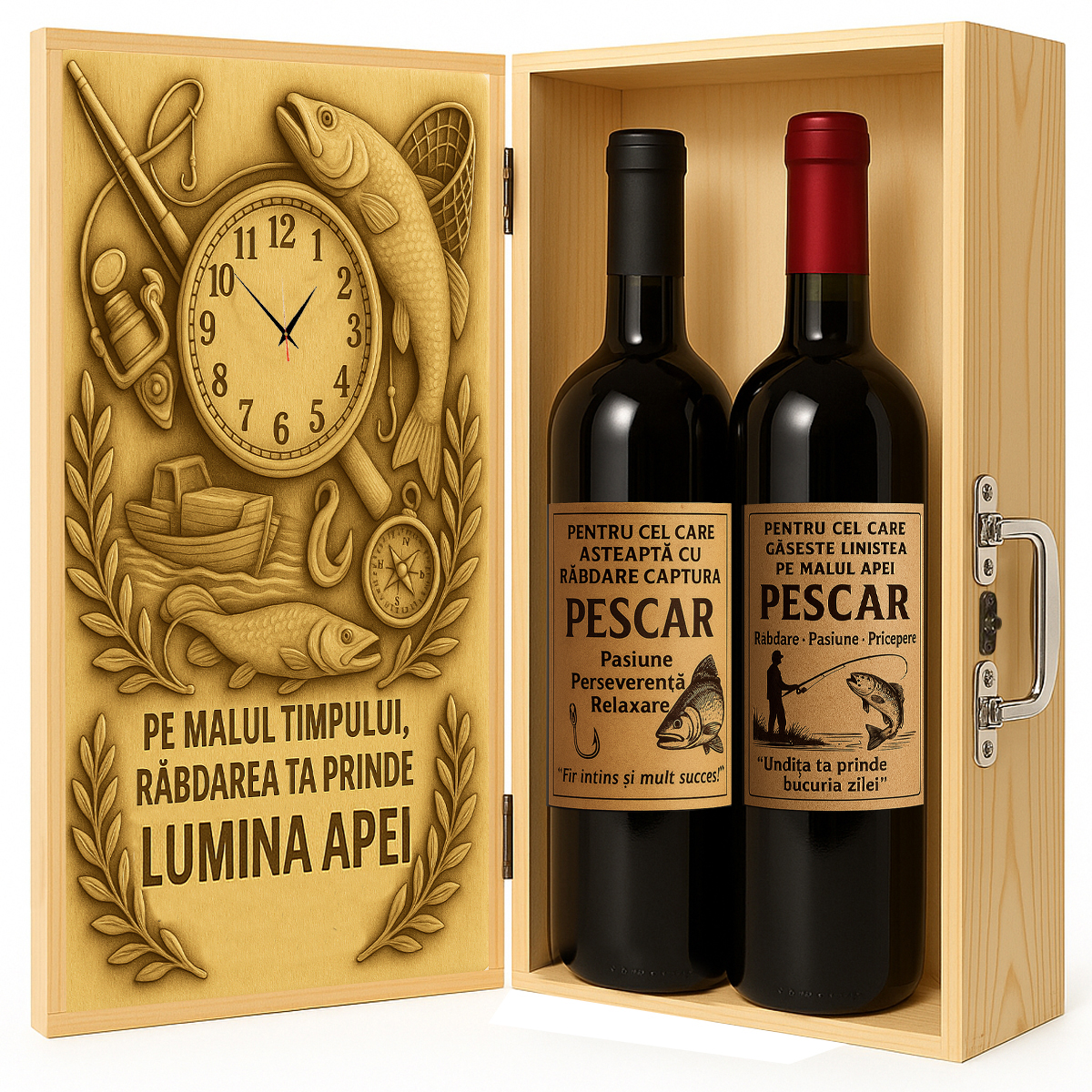 Interiorul este conceput cu atenție și include un ceas funcțional, simbol al răbdării și al timpului petrecut în natură. Setul conține două sticle de vin a 750 ml, fiecare cu etichetă personalizată, iar textele din interior pot fi adaptate pentru un mesaj de apreciere și prietenie.